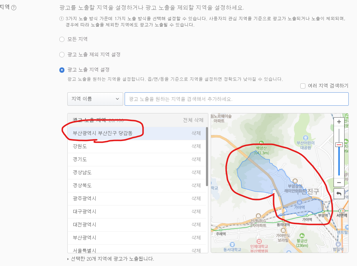 구글 애드워즈 지역광고를 확인해보니 지역 선택을 한 후 최소 5km 반경 이내까지 광고가 가능하며