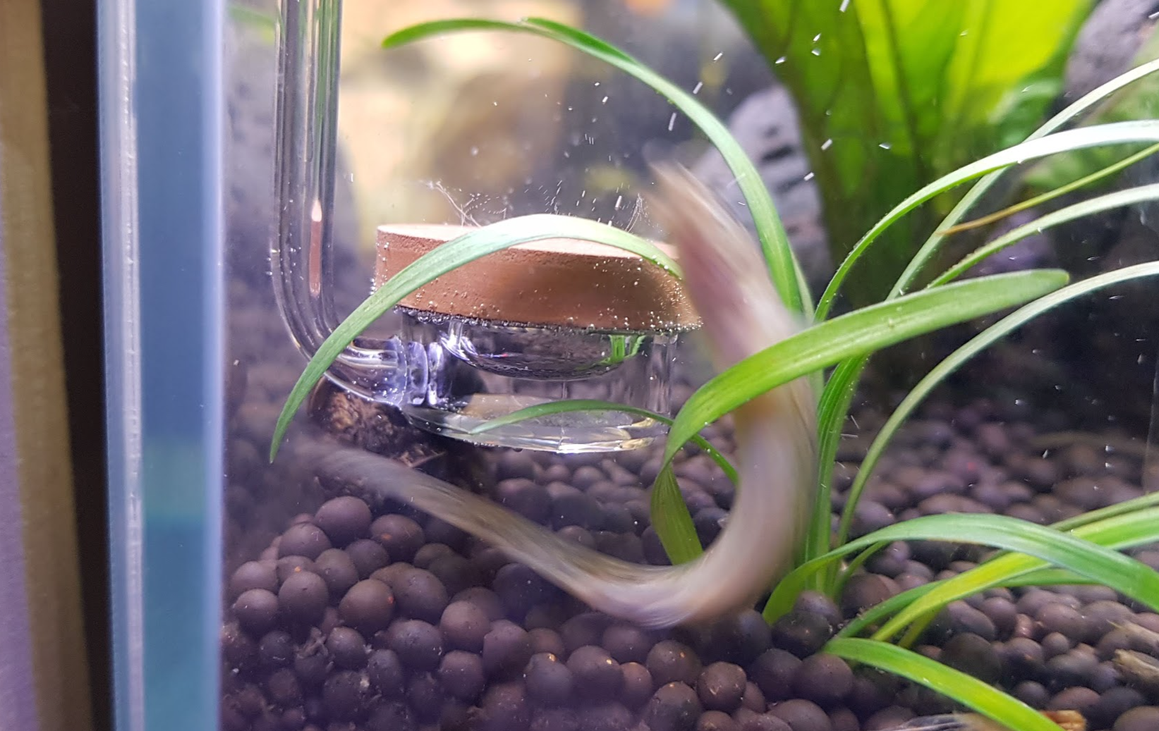 이건 기포가 작아서 그런가? 수면으로 올라가지 않고 먼지가 날리듯 어항으로 퍼져나간다.