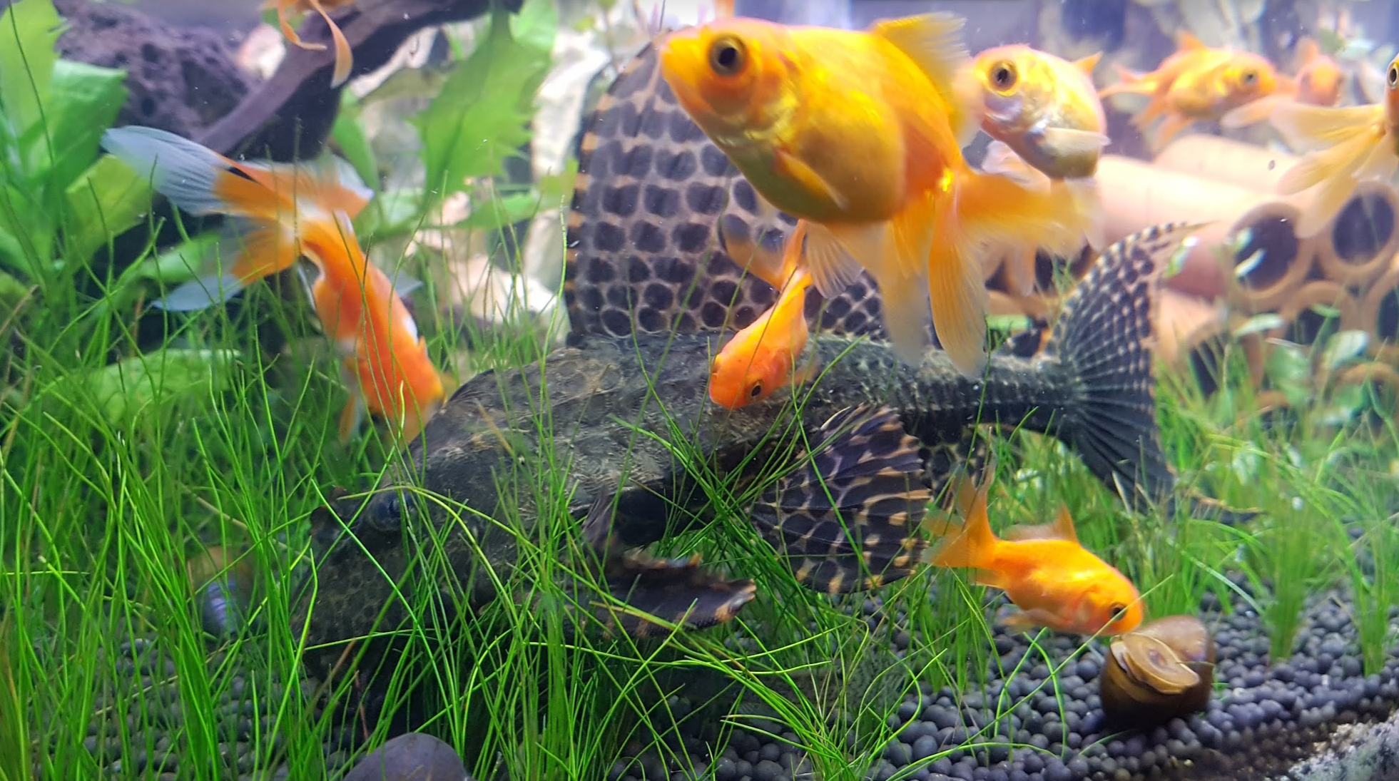 금붕어, 플레코씨, 미꾸라지, 다슬기, 논우렁이, 생이새우 모두 열심히 돌아다닌다.