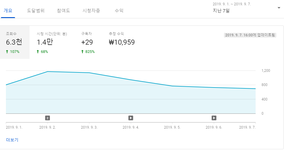 유튜브도 이제 하루에 천원씩 수익이 올라오기 시작했습니다. 아래 통계치는 최근 일주일간 입니다.
